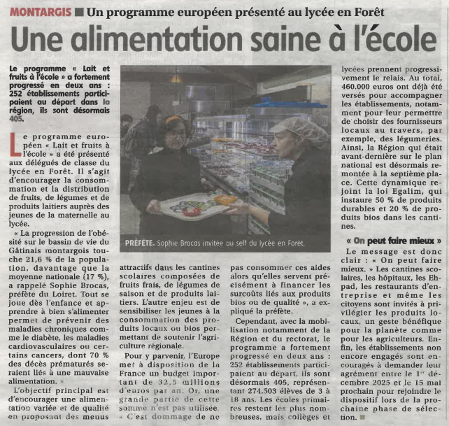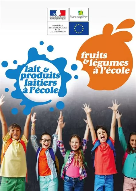 Le programme européen « Lait et fruits à l’école », soutient la distribution de fruits et légumes et/ou de lait et de produits laitiers aux enfants, dans les établissements scolaires, de la maternelle au lycée. Le programme a pour objectif d’ encourager les enfants à adopter des comportements alimentaires plus sains dès leur plus jeune âge. Il participe à mieux faire connaître, les filières et les produits agricoles et agroalimentaires, en particulier sous signes d’identification de la qualité et de l’origine (SIQO). Cette dynamique rejoint la loi Egalim, qui instaure 50 % de produits durables et 20 % de produits bios dans les cantines.