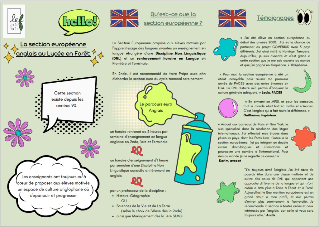 Les Sections Européennes proposent aux élèves motivés par l’apprentissage des langues vivantes un enseignement en langue étrangère d’une Discipline Non Linguistique (DNL) et un renforcement horaire en Langue en Première et Terminale.