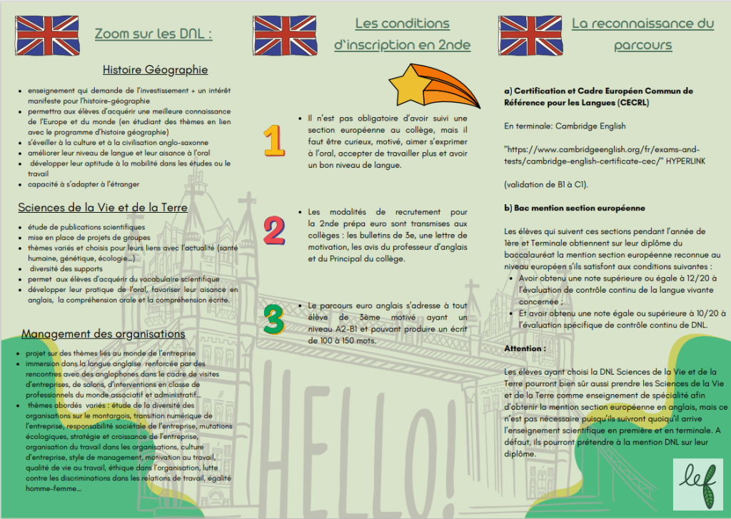 Le parcours euro anglais s’adresse à tout élève de 3ème motivé ayant un niveau A2-B1 et pouvant produire un écrit de 100 à 150 mots.