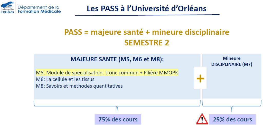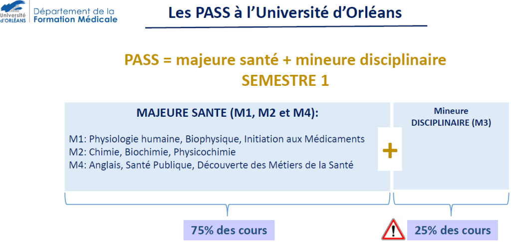 Le PASS s’articule autour d’une « Majeure santé » et d’une « mineure hors santé », dite « mineure disciplinaire » (par exemple : Maths, Physique, STAPS, …).