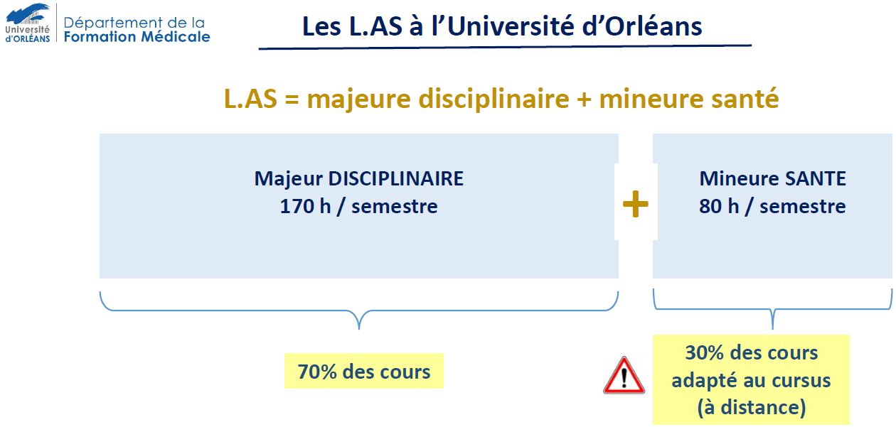 La L.AS est un parcours de formation universitaire s’articulant autour d’une « Majeure obligatoire hors santé » (bloc santé de 44 ECTS) et d’une « Mineure disciplinaire en santé » (16 ECTS, par exemple, économie-gestion, droit, physique, …).